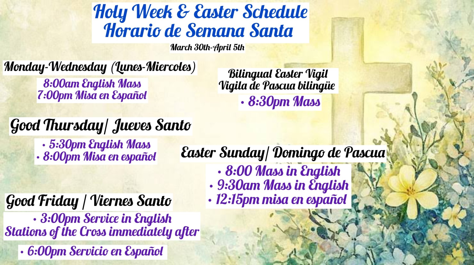 - Stations of the Cross English : 5:30pm (On Good Friday, Stations will be immediately after the 3pm Service)